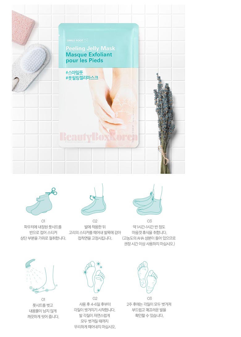Maske auf saubere, trockene Füsse aufziehen, 60–90 Minuten einwirken lassen, danach mit Wasser abspülen. In den nächsten Tagen beginnt der Peeling-Effekt.